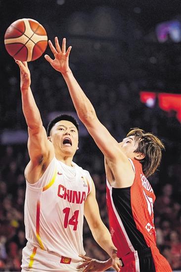 近日,在与日本队的比赛中,中国队李弘权(左)在上篮。新华社记者 贾浩成 摄